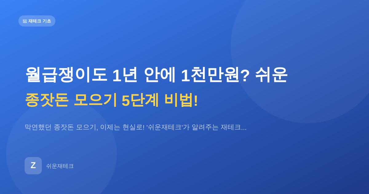 막연했던 종잣돈 모으기, 이제는 현실로! '쉬운재테크'가 알려주는 재테크 초보 맞춤 5단계 비법으로, 단기간에 목돈을 만들고 경제적 자유를 향한 첫걸음을 힘차게 시작하세요!