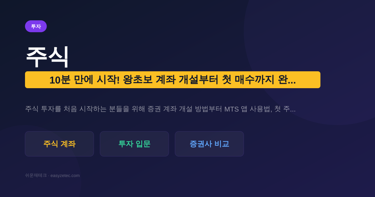 주식 투자를 처음 시작하는 분들을 위해 증권 계좌 개설 방법부터 MTS 앱 사용법, 첫 주식 매수까지, 모든 과정을 '쉬운재테크'가 친절하게 알려드립니다. 지금 바로 시작해보세요!