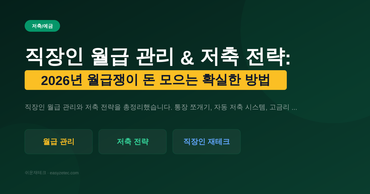 직장인 월급 관리와 저축 전략을 총정리했습니다. 통장 쪼개기, 자동 저축 시스템, 고금리 적금 활용법까지 2026년 월급쟁이가 확실하게 돈 모으는 실전 노하우를 알려드립니다.