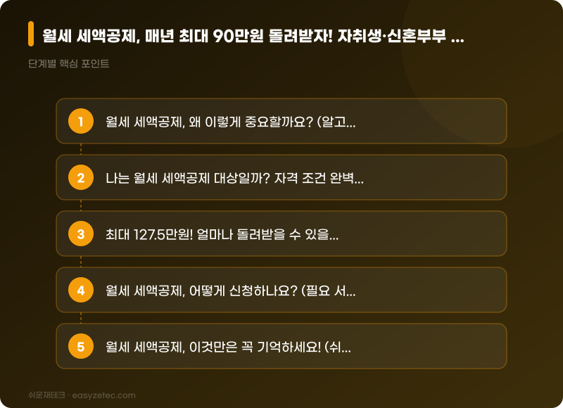 특히 월세 부담이 큰 사회 초년생이나 신혼부부에게는 이 작은 절세 혜택이 재테크의 든든한 시작점이 될 수 있어요! 재테크, 너무 어렵다고요? 왕초보도 성공하는 5단계 가이드!에서도 강조했듯이, '티끌 모아 태산'이라는 말처럼 작은 돈이라도 아끼고 모으는 습관이 결국 큰 부를 이루는 첫걸음이 된답니다.