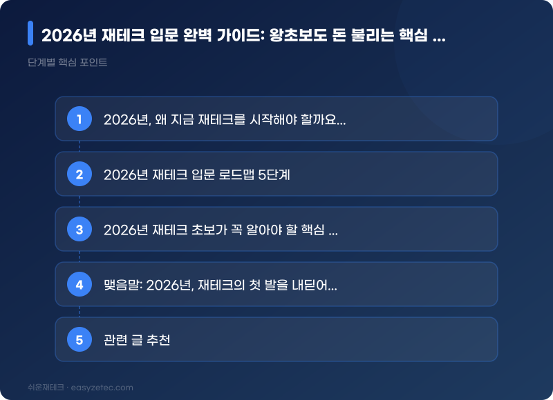 2026년 재테크를 처음 시작하는 분들을 위한 완벽 입문 가이드입니다. 저축부터 투자, 절세까지 왕초보도 따라 할 수 있는 단계별 로드맵과 실전 꿀팁을 모두 담았습니다.